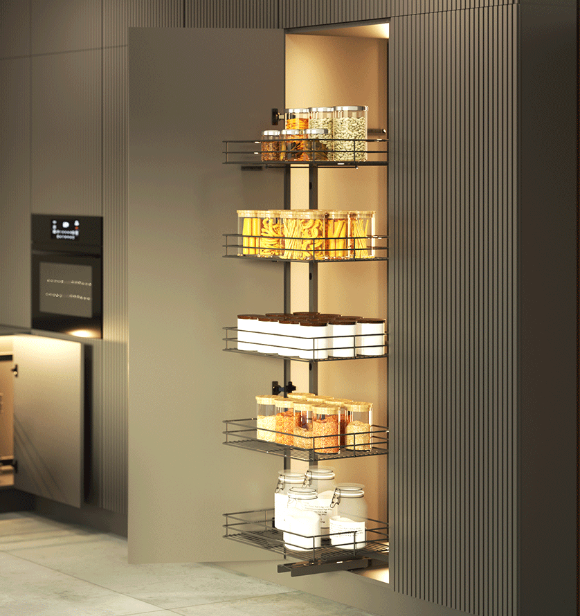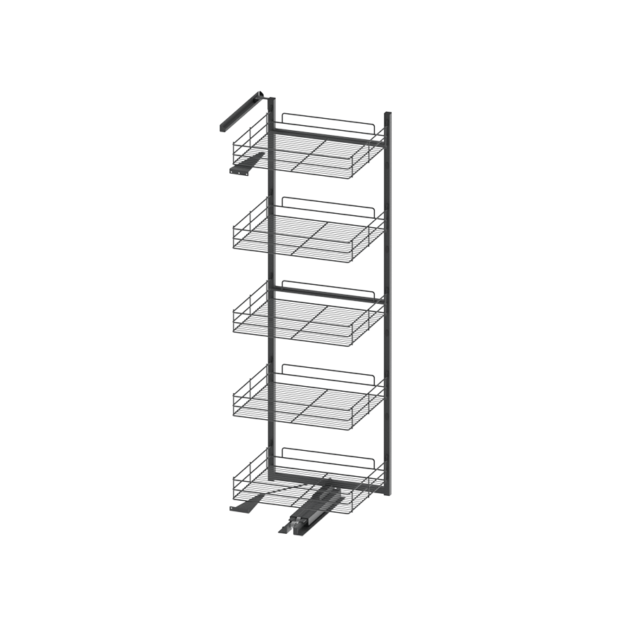 Cargo Maxi Space przeznaczone jest do wysokich szafek kuchennych szerokości 45 cm. Po otwarciu frontu szafki cargo automatycznie wyjeżdża na zewnątrz, zapewniając łatwy i szybki dostęp do przechowywanych produktów. Możliwość regulacji wysokości zawieszenia półek pozwala na dostosowanie ich wysokości do gabarytów przechowywanych rzeczy, co zwiększa funkcjonalność i komfort użytkowania wyrobu. Uniwersalna konstrukcja umożliwia montaż zarówno w szafkach otwieranych na lewą, jak i prawą stronę. Produkt dostępny jest z koszami ażurowymi chromowanymi lub lakierowanymi w kolorze grafitu.