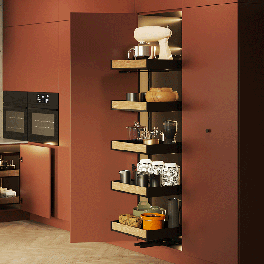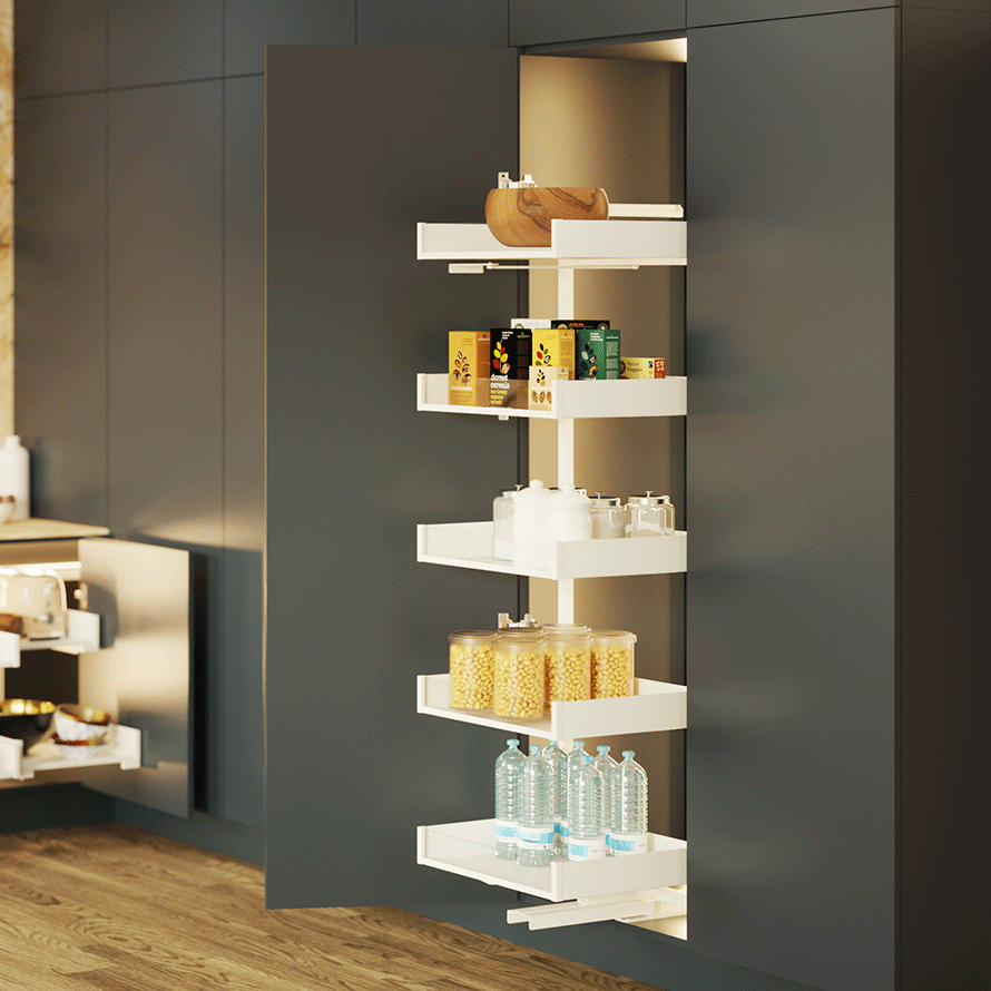 Cargo Maxi Space PURO przeznaczone jest do wysokich szafek kuchennych szerokości 45 cm. Po otwarciu frontu szafki cargo automatycznie wyjeżdża na zewnątrz, zapewniając łatwy i szybki dostęp do przechowywanych produktów. Możliwość regulacji wysokości zawieszenia półek pozwala na dostosowanie ich wysokości do gabarytów przechowywanych rzeczy, co zwiększa funkcjonalność i komfort użytkowania wyrobu. Uniwersalna konstrukcja umożliwia montaż zarówno w szafkach otwieranych na lewą, jak i prawą stronę. Produkt dostępny jest w wersji z pełnymi koszami w eleganckiej czerni z dekorem drewnianym lub ponadczasowej bieli ze szkłem.