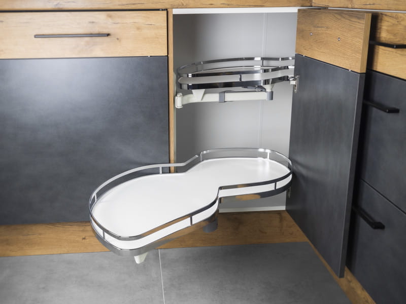 Półka SUPLIMO przeznaczona jest do szafki narożnej o minimalnej długości 110 cm. System pełnego wysuwu umożliwia łatwy dostęp do najdalej położonych przedmiotów, co znacznie ułatwia organizację kuchni. W rezultacie każdy przedmiot, nawet ten umieszczony w najdalszym zakątku szafki, jest łatwo dostępny bez konieczności wyciągania innych rzeczy. Stworzono ją dla każdego, kto szuka wygody i nowoczesnych rozwiązań w swojej kuchni. Kształt półek został zaprojektowany tak, by maksymalnie wykorzystać przestrzeń szafki. Półki Suplimo umożliwiają regulację wysokości, co pozwala na dostosowanie ich do różnorodnych rozmiarów przechowywanych przedmiotów. Funkcja cichego domyku umożliwia automatyczne, ciche domykanie półek. Dzięki temu półki zamykają się powoli i bezszelestnie, eliminując nieprzyjemne trzaski i hałasy, które mogą wystąpić przy zwykłym zamykaniu. Wyrób składa się z dwóch półek wykonanych z wysokiej klasy płyty meblowej ograniczonych relingami zabezpieczającymi przechowywane produkty przed spadkiem. Każda z półek wysuwa się oddzielnie ułatwiając dostęp do artykułów na nich się znajdujących. Półka SUPLIMO zaprojektowana została z myślą o udźwigu do 12 kg na półkę, świetnie sprawdzając się przy przechowywaniu ciężkich przedmiotów. Niezależnie od tego, czy są to ciężkie garnki, czy naczynia żaroodporne, półka gwarantuje stabilność i wygodę użytkowania, zapewniając bezpieczeństwo przechowywanych rzeczy. Wyroby są wykonane w wersji lewej lub prawej.